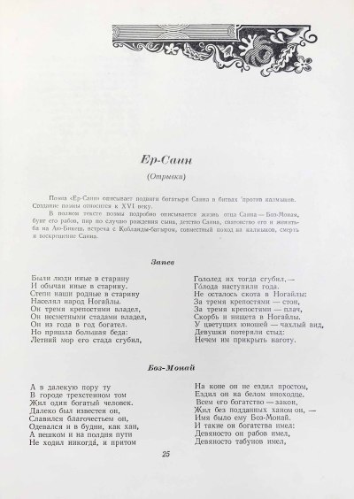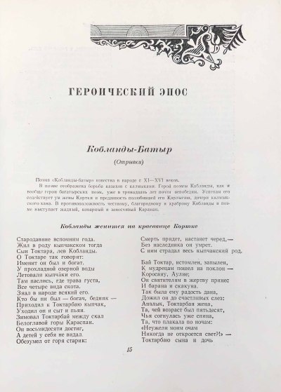 Казахстан представляет собою океан поэзии. Благодатным течением являются в нем чудесные эпические песни — от седой древности из века в век, от поколения к поколению, от прошлого к настоящему, к пламенному Махамбету, к мудрому Абаю, к мощному Джамбулу.