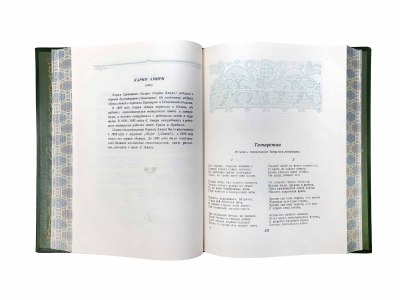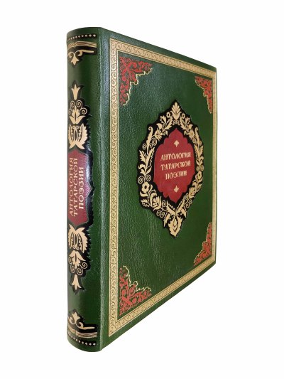 В цельнокожаном переплете с тиснением золотом. Иллюстрированные форзацы. Узорные обрезы книги.