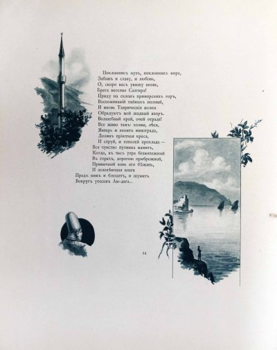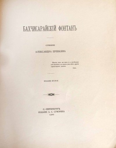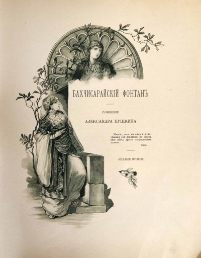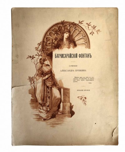 Библиофильское малотиражное издание поэмы Александра Сергеевича Пушкина «Бахчисарайский фонтан», с великолепными иллюстрациями художника, графика и акварелиста Сергея Сергеевича Соломко. Хромолитография, изображающая вид ханского дворца в Бахчисарае, — факсимиле рисунка на тарелке, принадлежавшей Императрице Екатерине II. Рисунки, помещенные в конце книги, — точные копии с тех, что украшали второе издание поэмы 1827 года. В издании были перепечатаны отрывок из «Путешествия по Тавриде» Муравьева-Апостола, приложенный к изданию 1824 года, и отрывок из письма Пушкина к Дельвигу, явившийся в третьем издании «Бахчисарайского фонтана».