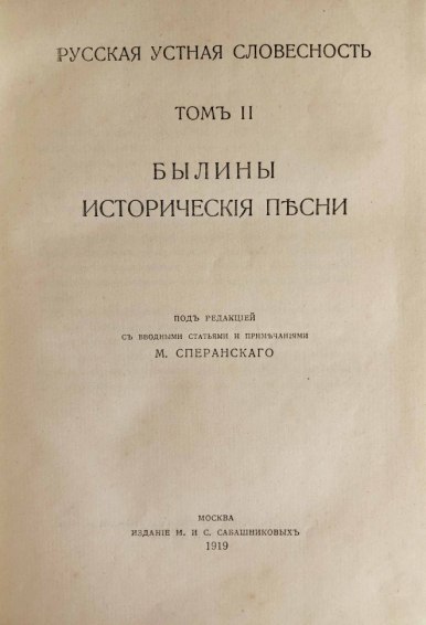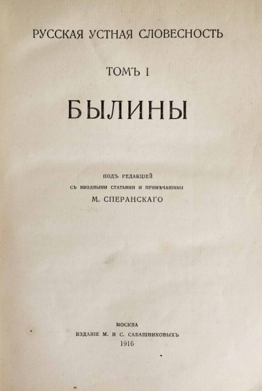 Былина — жанр русской народной эпической песни сказания о богатырях и их подвигах, исторических событиях Древней Руси, а также сама такая песня. Сборник, вышедший под редакцией и с комментариями члена-корреспондента Петербургской Академии наук по Отделению русского языка и словесности (история древнерусской и славянской литературы) М.Н. Сперанского.