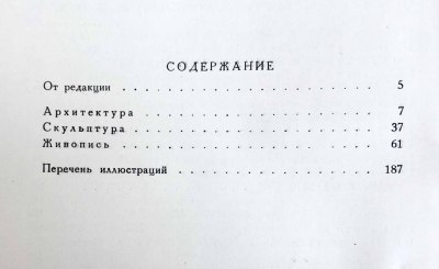 Альбом с многочисленными черно-белыми и цветными иллюстрациями, некоторые проложены защитной калькой. В издание вошли репродукции с произведений известных отечественных и иностранных художников, хранящиеся в Русском музеи, Третьяковской галереи и других музеев СССР. Альбом охватывает период от начала XIII века, вплоть до последних лет эпохи русского империализма. Содержание: Архитектура, Скульптура, Живопись.
