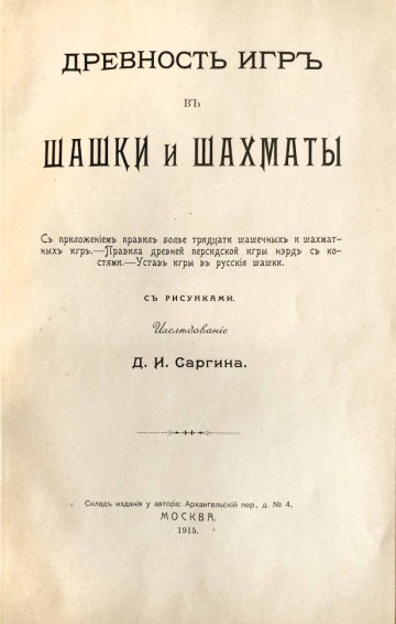 «Древность игр в шашки и шахматы» — монография Давыда Ивановича Саргина, посвящённая истории развития более 30 вариантов игры в шашки, шахматы (нарды, столбовые шашки, поддавки и т. д.), проникновении их в Европу и Россию. Исследование вышло в Москве в 1916 году и не переиздавалось. Давыд Иванович Саргин (1859 - 1921) — русский историк шахмат и шашек, шахматный и шашечный общественный деятель, журналист, шашечный композитор, один из основоположников шашечной композиции. Отличная сохранность.