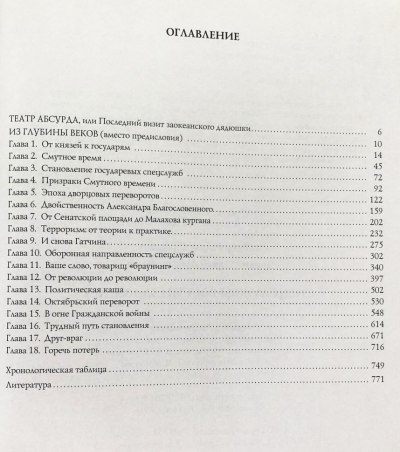 В книге изложена история формирования и развития специальных служб и специальных подразделений России на протяжении тысячи лет, начиная с Рюрика. В ней доказывается отрицательное влияние периодов смуты, ослабления государства и его институтов, многократных, зачастую «хирургических» реорганизаций специальных и правоохранительных органов.