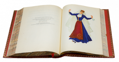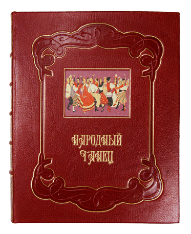 Фундаментальный труд по народно-сценическому танцу русской артистки балета, педагога, профессора, народной артистки РСФСР Тамары Степановны Ткаченко (1909 –1987). Книга «Народный танец» дает представление о богатстве народного танца и хореографического искусства в Советском Союзе. Автор сообщает много интересных исторических сведений, связанных с возникновением того или иного танца, говорит об эволюции хореографии той или иной страны, о связях ее с музыкой, живописью, трудом и бытом, о взаимоотношениях народного и профессио-нального искусства. Т.С. Ткаченко всегда отмечала, что танец – это душа народа и исполнителю народных танцев необходимо собственное яркое к нему отношение. Книга рекомендована Управлением кадров и учебных заведений Министерства культуры СССР в качестве учебного пособия для высших и средних учебных заведений искусства и культуры. Оформление художника Б. Шварца. Цветные иллюстрации художника П. Караченцова. Иллюстрации в тексте худож ников И. Госсе и Н. Васильева. Схемы танцев выполнены художником Б.А. Руссовским. В красном цельнокожаном переплете ручной работы с тиснением золотом и иллюстрацией на передней крышке. «Мраморный» обрез. Красное тонкое шелковое ляссе