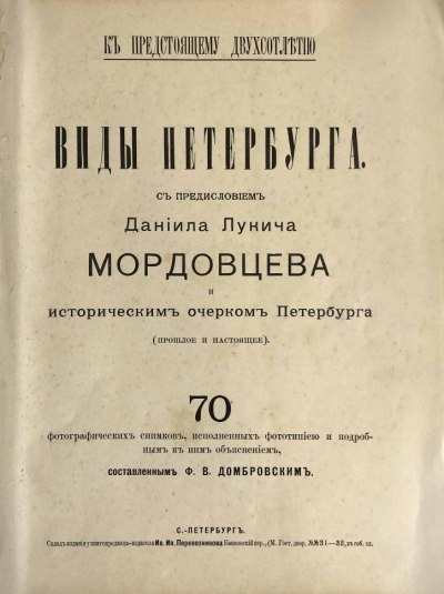 Виды Петербурга с предисловием Даниила Лукича Мордовцева и историческим очерком Петербурга (прошлое и настоящее). 70 фотографических снимков, исполненных фототипиею и подробным к ним объяснением, составленным Ф.В. Домбровским.