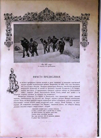 Титульный лист с имперской символикой, печатаный в два цвета, 1 л. фронтисписа (портрет Императора Николая II) и 15 л. иллюстраций на отд. листах (портрет Императора Александра I, репродукции картин П. Гессе, факсимиле, карты и проч.), не включенных в пагинацию. Со 182-мя илл. в тексте.