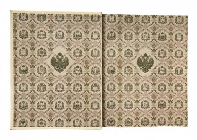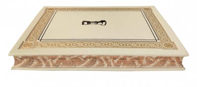 В коричневом цельнокожаном переплете ручной работы с тиснением золотом и иллюстрацией на передней крышке. «Мраморный» обрез. Коричневое тонкое шелковое ляссе.
