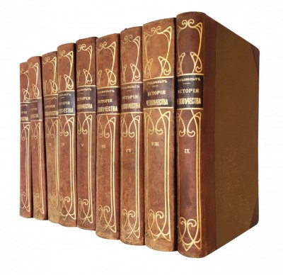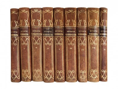 Идеально для роскошного представительского подарка высокопоставленному лицу. Фундаментальный труд известных немецких историков посвящен истории всего человечества на Земле. Это исследования, и история развития различных народов всех частей света. Материал расположен по этно-географическому принципу, что позволяет изучать исторический процесс с точки зрения эволюции. Каждый том посвящен определенной части света и рассказывает ее историю от самой глубокой древности до конца XIX века: : Том I посвящен Америке и Тихому океану. Том II — Океании, Восточной Азии и Индийскому океану. Том III — Западной Азии и Африке. Том IV — народам Средиземного моря. Том V — Юго-Восточной Европе и славянству. Том VI — германским и романским народам. Том VII — Западной Европе до 1800 года. Том VIII — Западной Европе в XIX столетии и Атлантическому океану. Заключительный, IX том выпущен в качестве дополнения к изданию и содержит в себе ряд статей по европейской истории, а также общий алфавитный указатель имен и предметов. Издание богато иллюстрировано множеством рисунков, фотографий, цветных и черно-белых таблиц, карт и приложений. Хорошая сохранность.