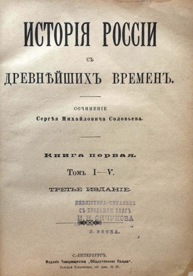 "История России с древнейших времен" была главным делом жизни знаменитого историка С. М. Соловьева. В XIX веке образцовым сочинением по истории России считалась «История государства Российского» Н. М. Карамзина. Соловьев с самого начала принялся за работу над «Историей России» с целью создать новое обширное описание истории Отечества, в котором бы последовательно прослеживалась идея исторического развития общества. Историк полагал, что основной предпосылкой развития государства являются не внешние факторы, такие как вражеские угрозы и завоевание земель, а естественные процессы — изменения, закономерно происходящие внутри государства и общества. Поэтому Соловьев отказывается от деления истории на периоды, отдавая первостепенное значение логическим связям явлений, «непосредственным преемствам форм».
