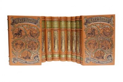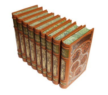 Каждый том в цельнокожаном переплете ручной работы с тиснением золотом.