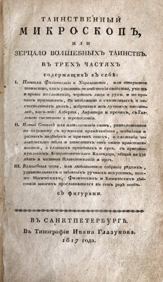 1. Правила физиогномии и хиромантии, или Открытое таинство как узнавать человеческие свойства, участь и нравы по сложению, чертам лица и рук и по прочим признакам; с таблицею о счастливых и несчастливых днях. Избранные из лучших писателей. В двух отделениях с гравированными фигурами.