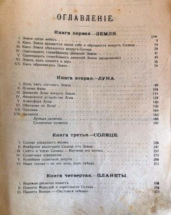«Земля среди небесъ. Эта книга написана для тѣхъ, кто привыкъ отдавать себѣ отчетъ въ окружающемъ и былъ бы радъ безъ особаго труда пріобрѣсти элементарныя, но точныя свѣдѣнія объ устройствѣ вселенной. Развѣ нѣтъ удовольствія въ созерцаніи величественныхъ зрѣлищъ природы?»