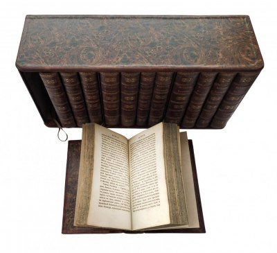 Каждая книга в цельнокожаном переплете ручной работы, сделанном под эпоху того времени. С тиснением золотом, в футляре. С раскладными вкладками родословных российских князей и картами.