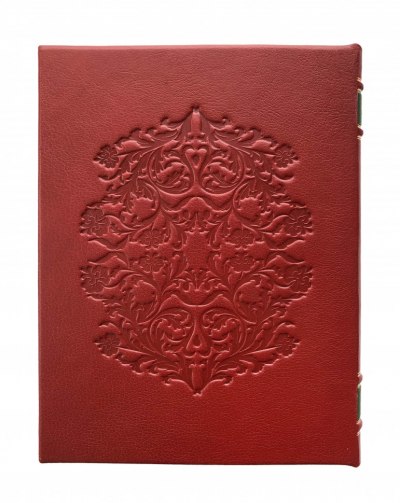 В цельнокожаном переплете ручной работы с тиснением золотом и иллюстрацией. Иллюстрированные форзацы.