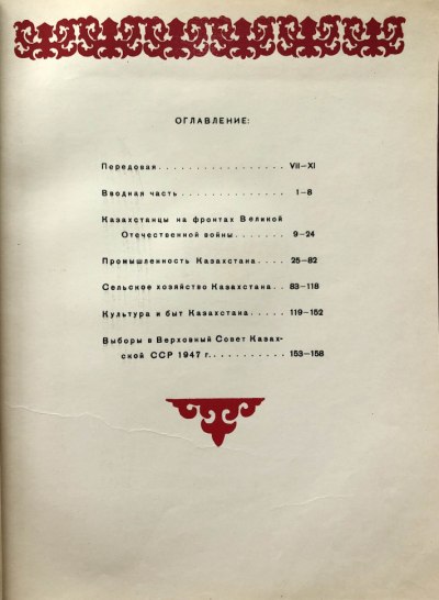Книга поделена на несколько разделов: первый раздел посвящен Казахстанцам на фронтах Великой Отечественной войны. Второй промышленности Казахстана. Третий посвящен сельскому хозяйству. Четвертый описывает культуру и быт Казахстана и в последнем показаны выборы в Верховный Совет Казахской ССР 1947 года.