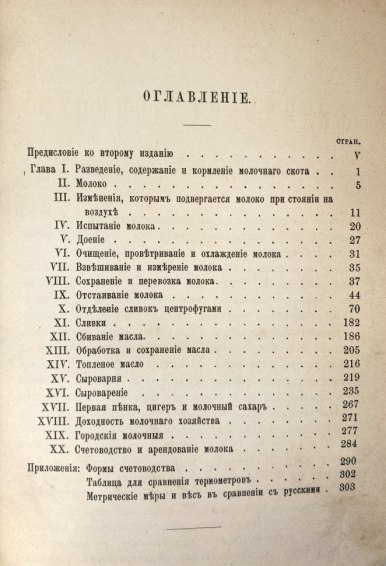 В начале рассказано как разводить, кормить и содержать коров, потом идут подробные инструкции про испытания, очищение и отстаивание молока, также про обработку и хранение сливок, масла и, наконец, сыра. Это редкое антикварное издание со множеством иллюстраций и схем.