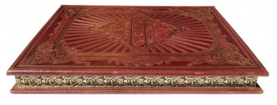 В цельнокожаном переплете ручной работы с тиснением золотом. Дизайнерские форзацы. Узорный обрез.