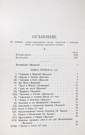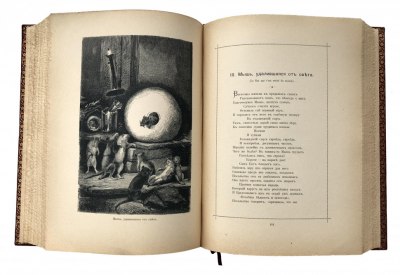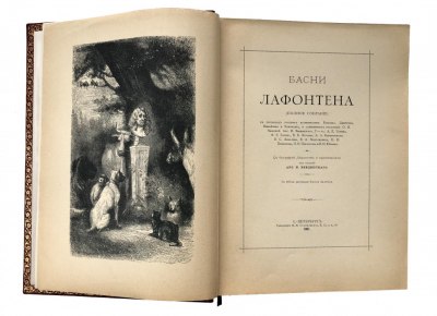 Басни Лафонтена представляют собой одно из великих явлений всемирной литературы. До 1901 г. на русском языке не было их полного сборника, настоящее роскошно иллюстрированное издание восполнило этот существенный пробел. Оно отпечатано на высококачественной бумаге, богато иллюстрировано множеством рисунков в лист, выполненных в технике торцевой гравюры на дереве. Образы к басням созданы знаменитым французским художником-анималистом Эженом-Луи Ламбером (1825-1900). Они были признаны на тот момент самым удачным опытом иллюстрирования произведений французского баснописца.
