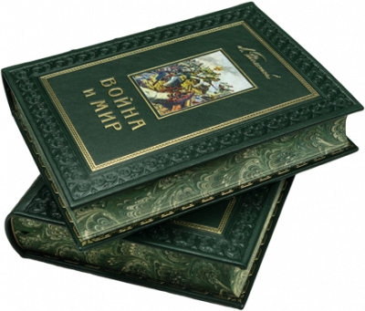 Настоящее издание великого произведения русской и мировой литературы — романа-эпопеи Л.Н. Толстого «Война и мир» вышло в 1960 году к пятидесятилетию со дня кончины писателя. Текст книги напечатан по тексту юбилейного первого полного собрания сочинений Л.Н. Толстого. Оба тома содержат многочисленные полноцветные (в лист) иллюстрации известного русского художника и графика Владимира Александровича Серова (1910–1968). В созданной в 1951–1953 годах серии рисунков к «Войне и миру» Серов изобразил портреты автора и действующих лиц, попытавшись проникнуть в их духовный мир, а также и ключевые сцены романа. Каждый том в зеленом цельнокожаном переплете ручной работы с золотым тиснением и иллюстрацией на передней крышке. Обрез покрашен под «павлинье перо»
