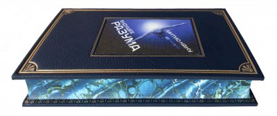 В синем цельнокожаном переплете ручной работы с тиснением золотом и иллюстрацией на передней крышке. Синий тонированный обрез.