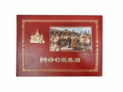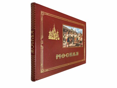 В красном цельнокожаном переплете ручной работы с золотым тиснением и иллюстрацией на передней крышке.