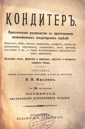 В красном цельнокожаном переплете ручной работы с золотым тиснением и инкрустацией на передней крышке. Автор книги Н.Н. Маслов, составил книгу на основании многолетней практики. Он учился кондитерскому искусству у лучших петроградских кондитеров. Затем был приглашен преподавателем в «Первую практическую школу поварского искусства». С помощью книги можно приготовить ягодный паштет, желе «Холодный дипломат», гадательный торт, пряник «Московская мостовая» и многое другое.
