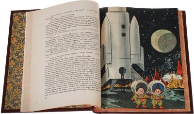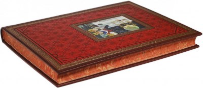 В цельнокожаном переплете ручной работы с тиснением золотом и иллюстрацией на передней крышке.