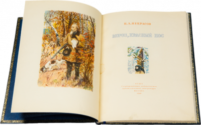 Издание знаменитой поэмы, одного из самых узнаваемых произведений Николая Алексеевича Некрасова (1821–1877), созданной поэтом в 1863 году. 18 февраля 1864 г. Некрасов читал «Мороз, Красный нос» на вечере Литературного фонда. Поэт обратился к слушателям с небольшим вступлением: «Мне хотелось написать несколько картинок русской сельской жизни; я попытался изобразить судьбу нашей русской женщины...» Некрасов подчеркивал, что крестьянская жизнь в этом и других произведениях, изображена им такой, какой она является в действительности. Настоящее издание поэмы 1949 года — с иллюстрациями русского живописца, одно-го из наиболее ярких и самобытных мастеров, посвятивших свое творчество русской- деревне Аркадия Александровича Пластова (1893–1972). Уже при жизни Пластов получил признание, его произведения воспроизводились в книгах для детей и даже в учебниках. Все произведения художника обладают ярко выраженным национальным характером. Яркость и эмоциональность замысла отличают рисунки Пластова к поэме «Мороз, красный нос», созданные в 1948–1949 годах. В синем цельнокожаном переплете ручной работы с тиснением золотом. Обрез синего крапления. Синее тонкое шелковое ляссе.