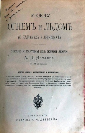 Типографский переплет. В книгу «Между огнем и льдом (О вулканах и ледниках)» вошли очерки из жизни земли. Здесь собраны статьи, которые автор печатал в разное время в детских журналах, преимущественно во «Всходах» и отчасти в «Юном читателе». Книга эта стоит в тесной связи с другой книгой А. П. Нечаева «В царстве воды и ветра». Там идет речь о работе воды и ветра, здесь о вулканах, землетрясениях и ледниках. Обе книжки довольно плотно охватывают вопросы того отдела физического землеведения, который носит название динамики суши. Любопытные илл. конца ХIХ — начала ХХвека, в т.ч. пожар нефтяного фонтана в Балаханах, карта вулканов Камчатки, завал Девдорацкого ледника в 1893 г., труп, выкопанный из-под пепла, засыпавшего Помпею, храм огнепоклонников в старину и в настоящее время, и пр. Всего 102 илл. Из содержания: жертвы подземных сил, в царстве Везувия, новые острова и горы, великие катастрофы, Фингалов грот, огненные озера, Арарат, холодный Кавказ, лавины, безмолвные странники, гиганты Кавказа, страна вулканов —Камчатка, грозные невидимки, из недр земли, земля трясется, в мире миров.