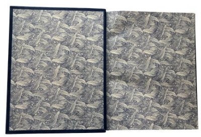 В цельнокожаном переплете ручной работы с тиснением золотом и иллюстрацией на передней крышке.