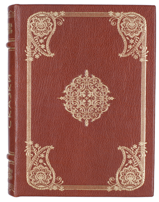 В коричневом цельнокожаном переплете ручной работы с тиснением золотом. Коричневый тонированный обрез. Коричневое тонкое шелковое ляссе