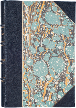 В полукожаном переплете ручной работы. Крышки оклеены «мраморной» бумагой. Корешок и углы из черной кожи.