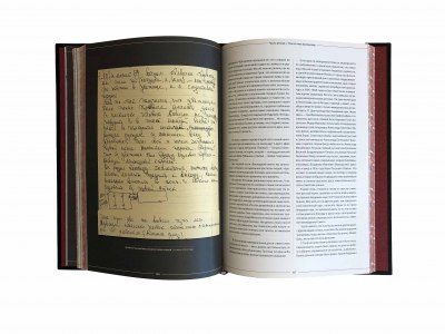 Подарочное издание в кожаном переплете, с золотым и блинтовым тиснением, вручную расписанным краской трехсторонним обрезом и ляссе.