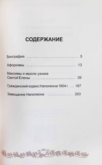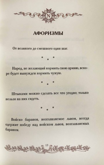 Наполеон Бонапарт (1769-1821) — французский император в 1804-1815 годах, полководец и государственный деятель, заложивший основы современного французского государства. Интерес к его литературному наследию не угасает до сих пор. Его изречения — остроумные и язвительные, касающиеся политической истории, литературы, философии, — удивительно актуальны для нашего времени и блестяще характеризуют Наполеона, человека необычайной храбрости и огромного самомнения. Вниманию читателей предлагаются собственноручные записи императора, его высказывания, записанные современниками, и суждения Наполеона, ставшие плодом его нелегких раздумий в последнем пристанище на острове Святой Елены. В книгу также вошли «Гражданский кодекс 1804 года» и «Завещание» Наполеона Бонапарта. Издание рассчитано на широкий круг читателей.