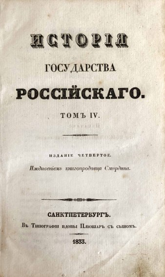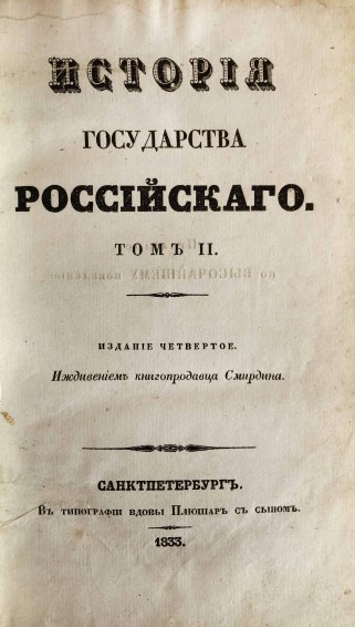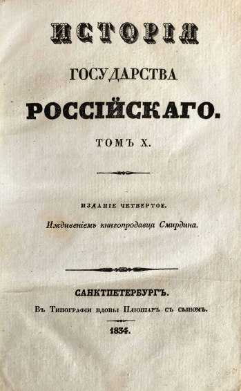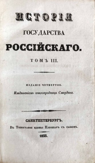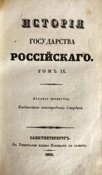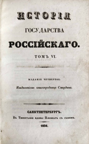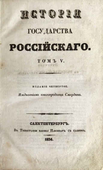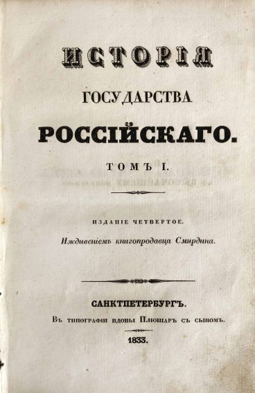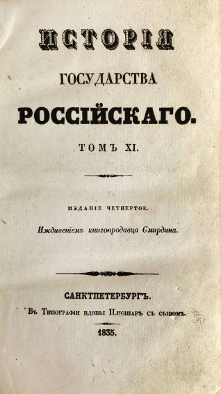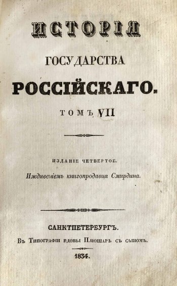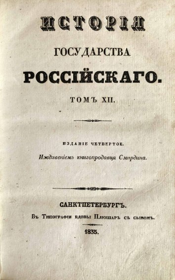 «История государства Российского» — многотомное сочинение Н. М. Карамзина, описывающее российскую историю начиная с древнейших времен до правления Ивана Грозного и Смутного времени. Труд Н. М. Карамзина не был первым описанием истории России, но именно это произведение благодаря высоким литературным достоинствам и научной скрупулезности автора открыло историю России для широкой образованной публики и наибольшим образом способствовало становлению национального самосознания. Карамзин писал свою «Историю» до конца жизни, но не успел ее закончить. Текст рукописи 12 тома обрывается на главе «Междоцарствие 1611-1612», хотя автор намеревался довести изложение до начала правления дома Романовых.