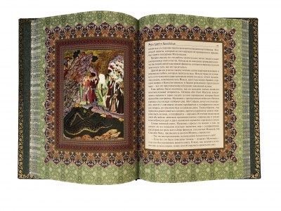 Книга в цельнокожаном переплете ручной работы с тиснением золотом и иллюстрацией на передней переплетной крышке. Узорные обрезы.