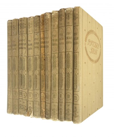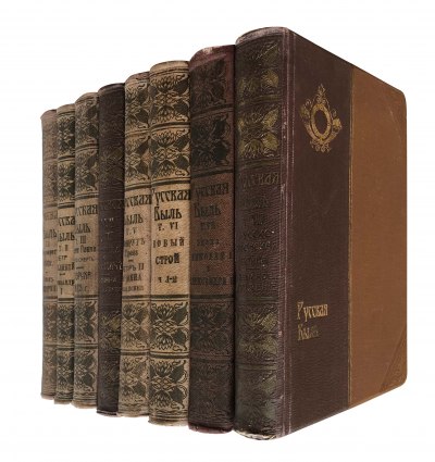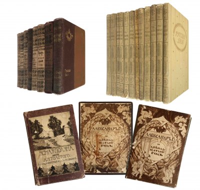 Многотомники в коленкоровых издательских переплетах с золотым тиснением. Альбомы, исполненные фото-тинто гравюрой в издательских составных папках.