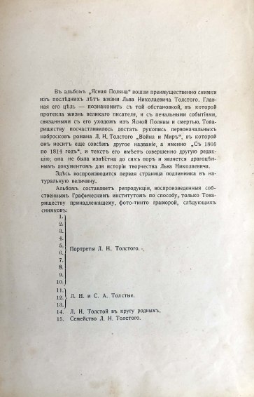 Художественно-исторические альбомы: В первом выпуске в основном помещены портреты обоих императоров, членов их семей и правящей знати. В третьем выпуске — картины, изображающие жизнь начала XIX века: нравы, быт и костюмы как военных, так и партикулярных людей, главным образом, обеих столиц. Кроме того, в третью часть входят и портреты главнейших деятелей войны. В альбом "Ясная поляна. Жизнь Л. Н. Толстого" вошли преимущественно снимки из последних лет жизни Л. Н. Толстого.