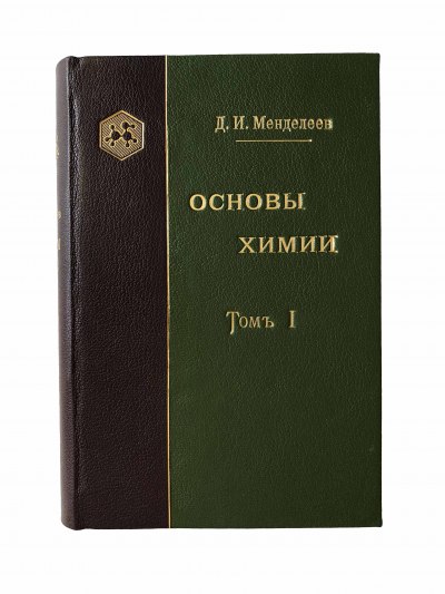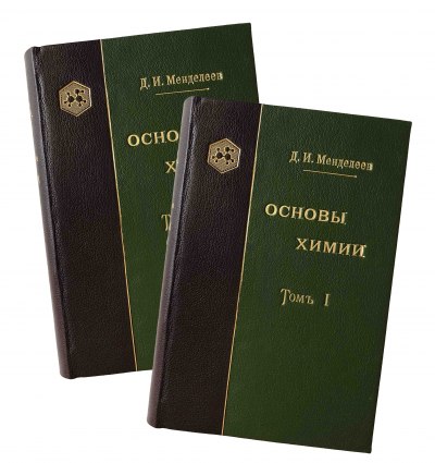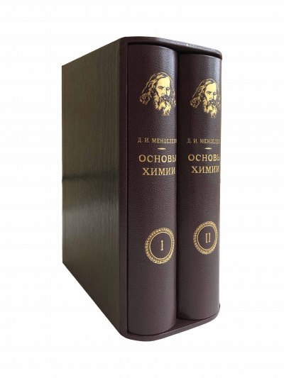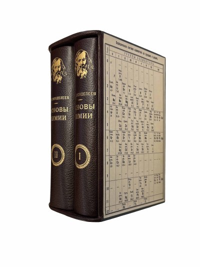 Книги в цельнокожаных переплетах ручной работы с тиснением золотом. На задней сторонке переплетных крышек сделан золотой оттиск цитат Менделеева. В футляре. С раскладными вкладками.