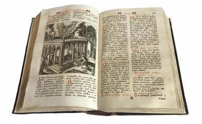 Книга в цельнокожаном переплёте эпохи. Печать в две краски. Орнаментальные инициалы и буквицы.