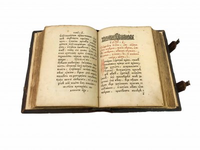 Книга в переплёте эпохи: доски, обтянутые кожей с блинтовым тиснением. Имеются две застежки. Реставрация корешка. Печать в две краски. Орнаментальные заставки, концовки и буквицы.