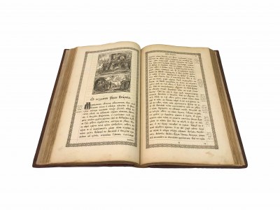 Книга в переплёте эпохи с блинтовым тиснением. Гравированные заставки, инициалы, концовки, рамки на полях. Большой формат.