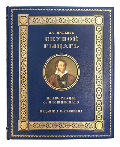 В цельнокожаном переплете с золотыми художественными рамками, а также портретом А. С. Пушкина. Орнаментальные форзацы. Золотой обрез. Книга большого формата.