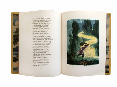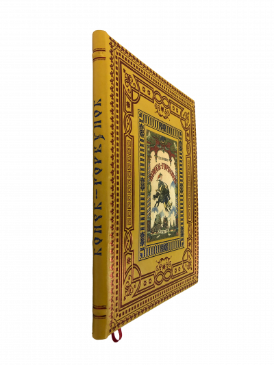 В цельнокожаном переплете ручной работы с тиснением золотом и иллюстрацией на передней крышке. Цветной обрез. Дизайнерские форзацы.