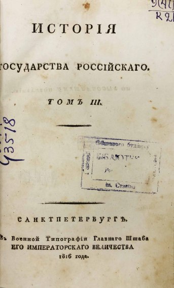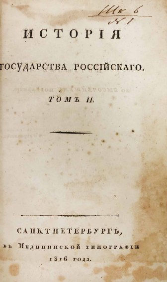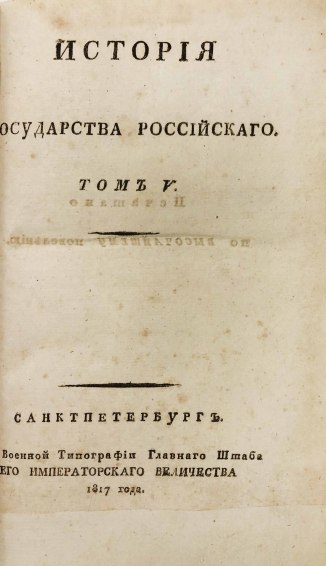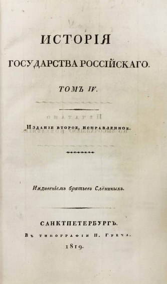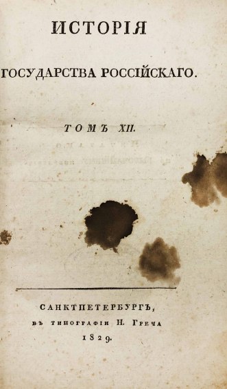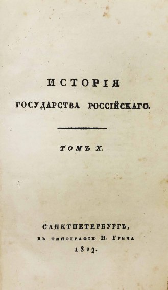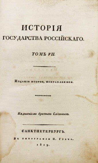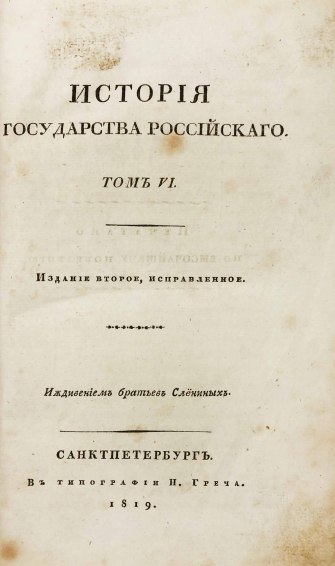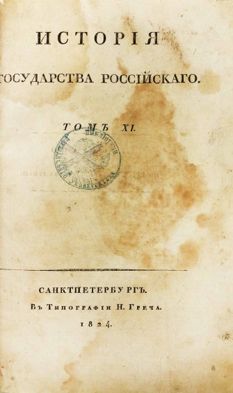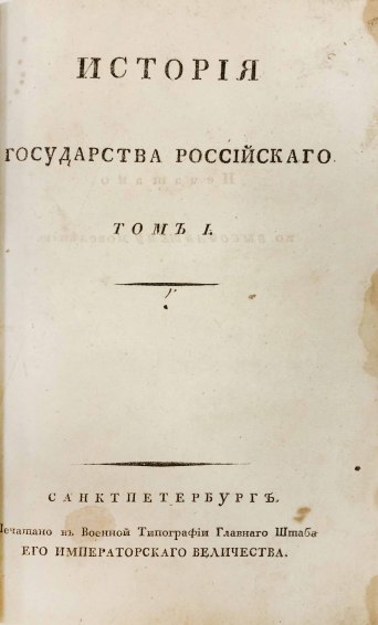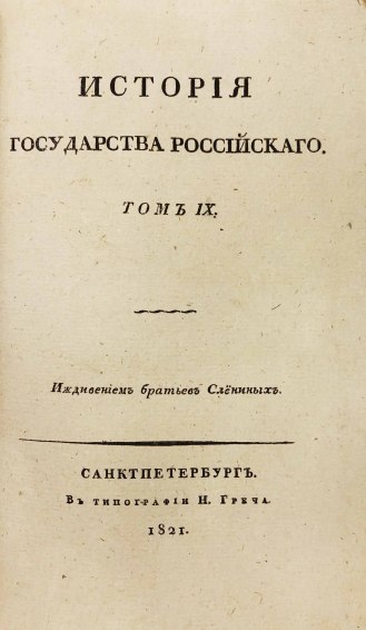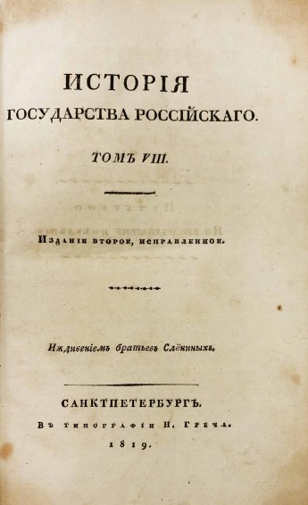 В 1816 году были изданы первые 8 томов «Истории государства Российского». Книги печатались одновременно в нескольких типографиях при финансовой поддержке Александра I. В 1826 году Карамзин умер, не успев дописать 12-й том, который был издан Д. Н. Блудовым в 1829 году по бумагам, оставшимся после Николая Михайловича.