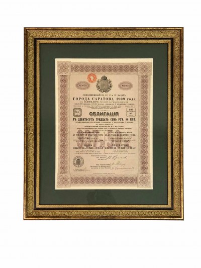 Старинная облигация. Оформлена в паспарту, в раме за стеклом.