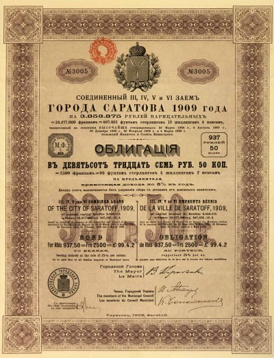 Соединенный III, IV, V, и VI заем города Саратова 1909 года. 5-процентная облигация в 937 рублей 50 копеек на предъявителя.
