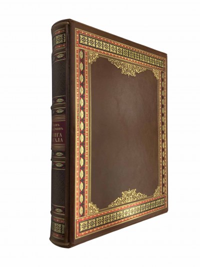 Книга в цельнокожаном переплете ручной работы с сочетанием цветного, блинтового и золотого тиснения. Кожаный подарочный футляр.
