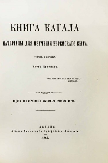 "Книга Кагала" Якова Брафмана в первые была издана в 1869 году в г. Вильно. В данной книге напечатан русский перевод 285 кагальных актов, относящихся к 1794-1803 годам. На основании которых автор доказывал, что Кагал фактически продолжает существовать и, опираясь на раввинский суд, представляет собою государство в государстве, с организованной системой угнетения личности общиной, корпоративной эксплуатацией христианского населения и упорной отчужденностью от всего не еврейского.