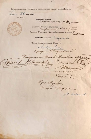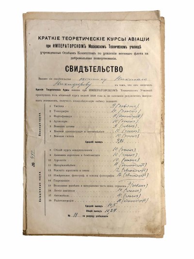 Свидетельство о прохождении кратких теоретических курсов авиации при Императорском Московском Техническом училище. Курс длился 4 месяца.